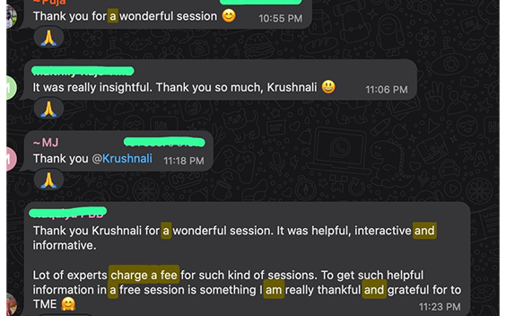 Thank you Krushnali for this wonderful session. It was helpful, interactive & informative. Lot of experts charge a fee for such kind of sessions. To get such helpful information in a free session is something I am really grateful for to TME..